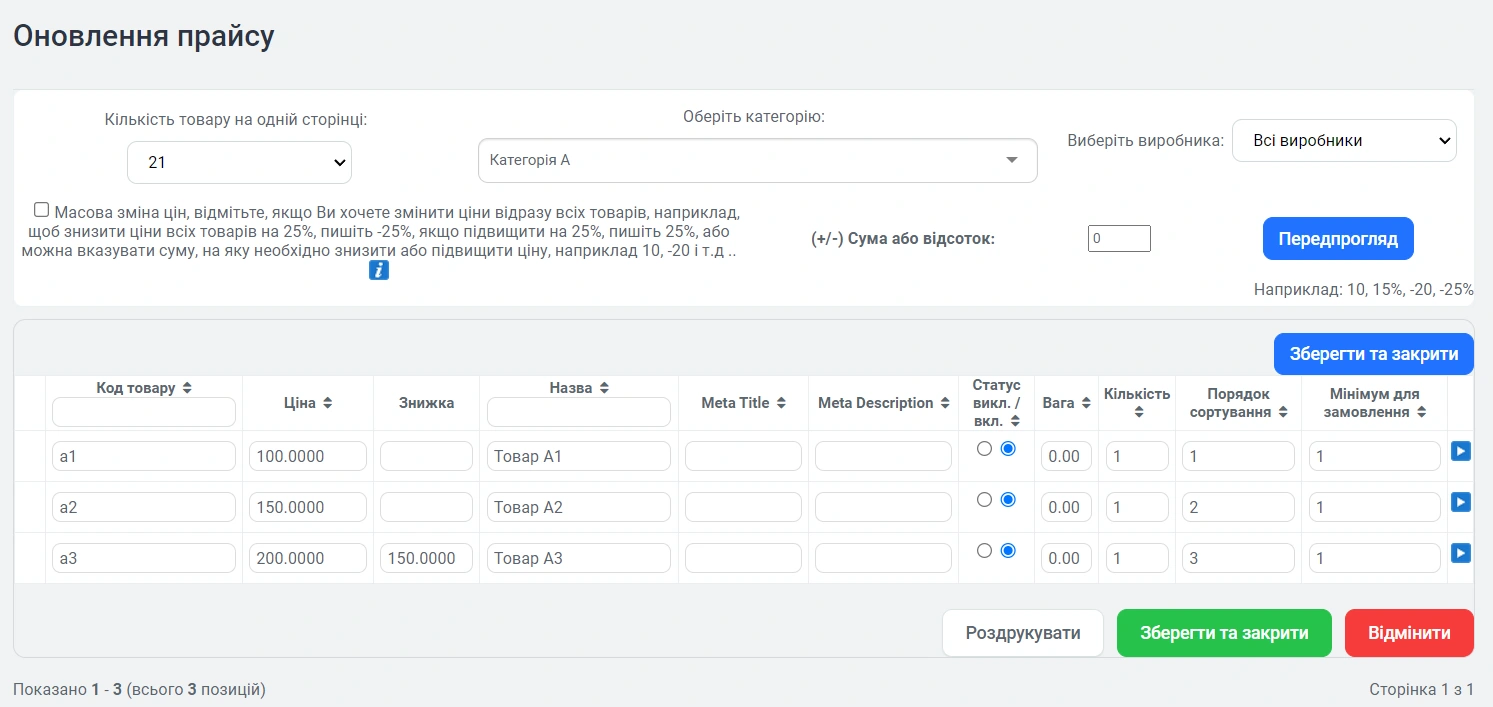 На сторінці "Товари" - "Оновлення прайсу" ви маєте змогу встановлювати знижки для ваших товарів, масово змінювати їх код (артикул), ціну, назву, meta title, meta description, статус, вагу, кількість, порядок сортування та мінімум для замовлення.