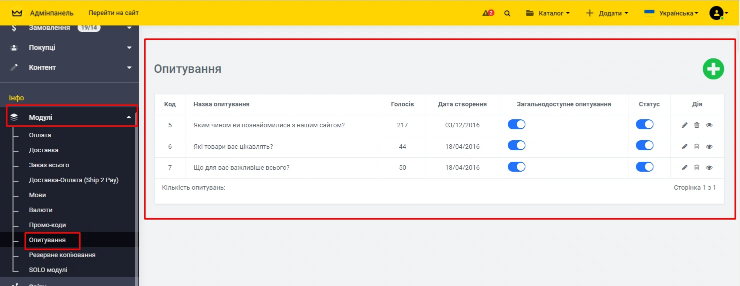 Управління здійснюється через панель адміністрування: "Модулі" -> "Опитування"