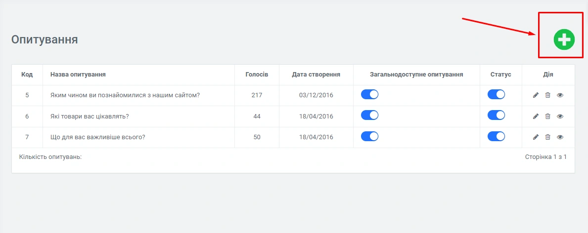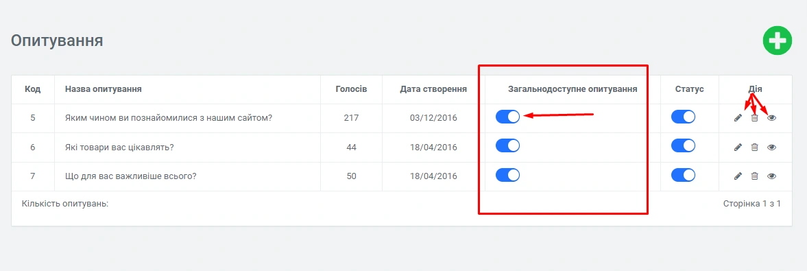 Також у Вас є можливість редагувати опитування чи видаляти вже непотрібні рядки. У колонці "Загальнодоступне опитування" Ви можете зробити опитування для всіх користувачів (статус - включений), або тільки для зареєстрованих користувачів (статус - вимкнено)