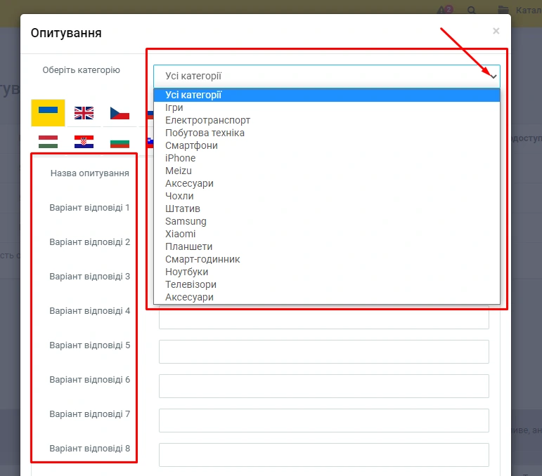 У новому вікні, можна вибрати певну категорию для опитувань, або ж залишити "Всі категорії", додати варіанти питань у кількості, яку Вам необхідно: