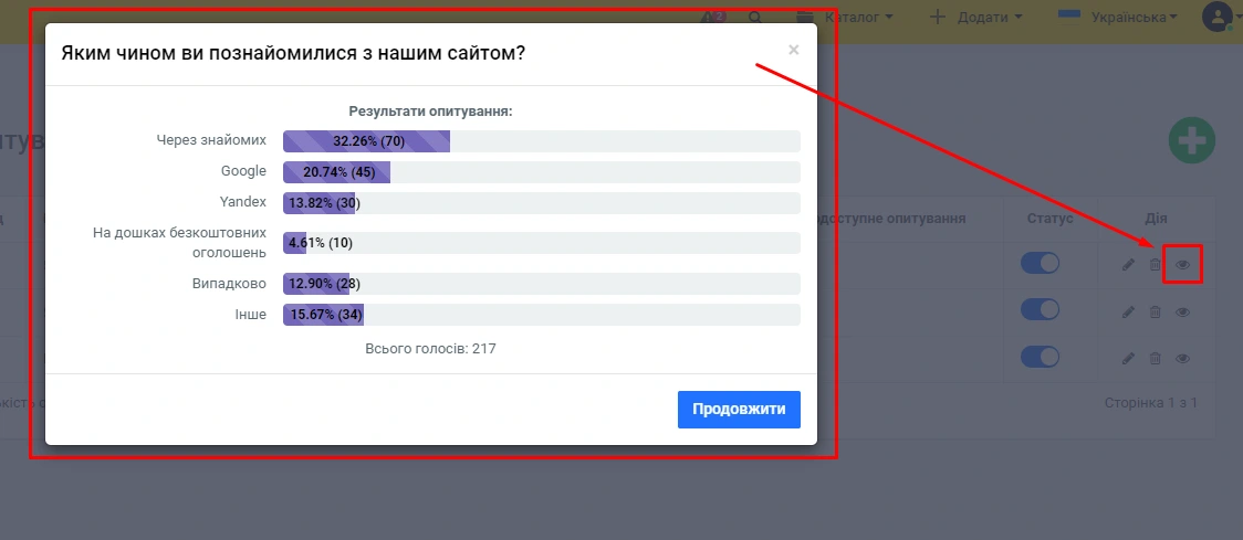 При натисканні на іконку "Перегляд" - Ви маєте можливість переглянути звіт з результатами голосів/відповідей
