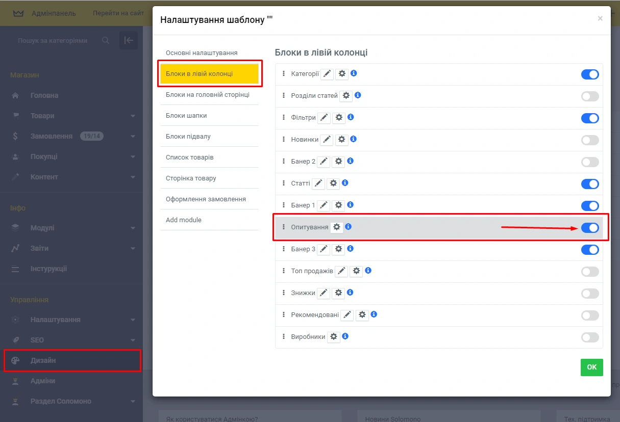 Для відображення модуля опитувань на сайті потрібно включити статус в панелі адміністрування: «Дизайн» -> «Блоки в лівій колонці» -> «Опитування»