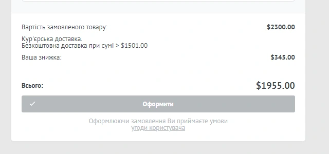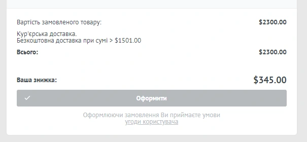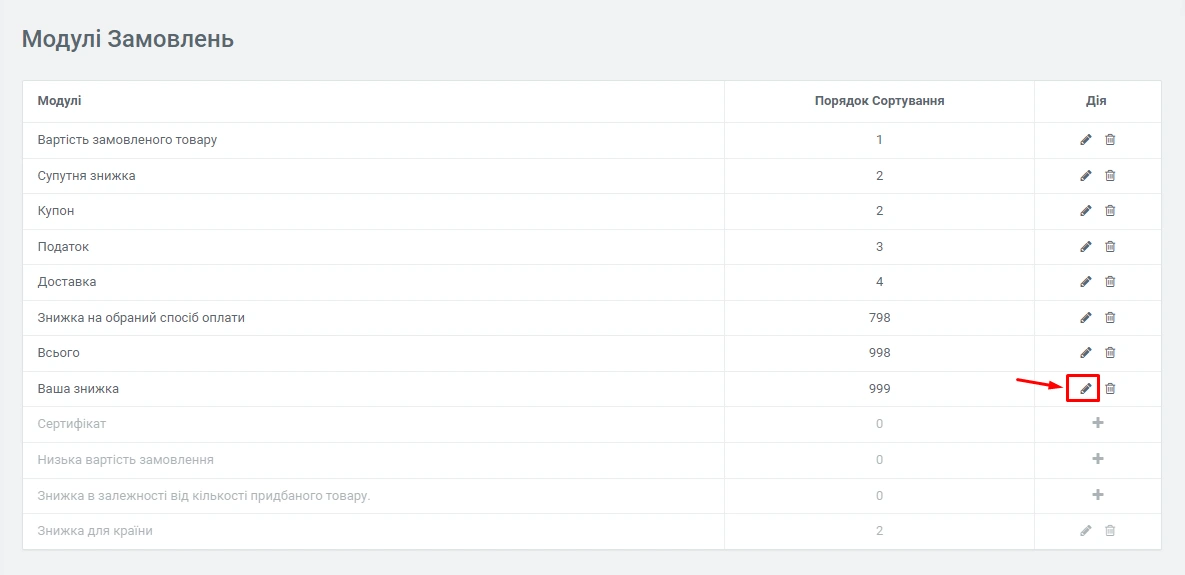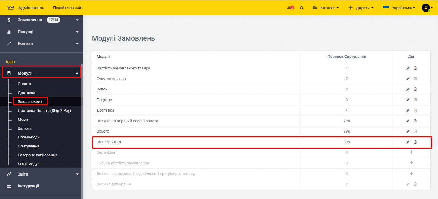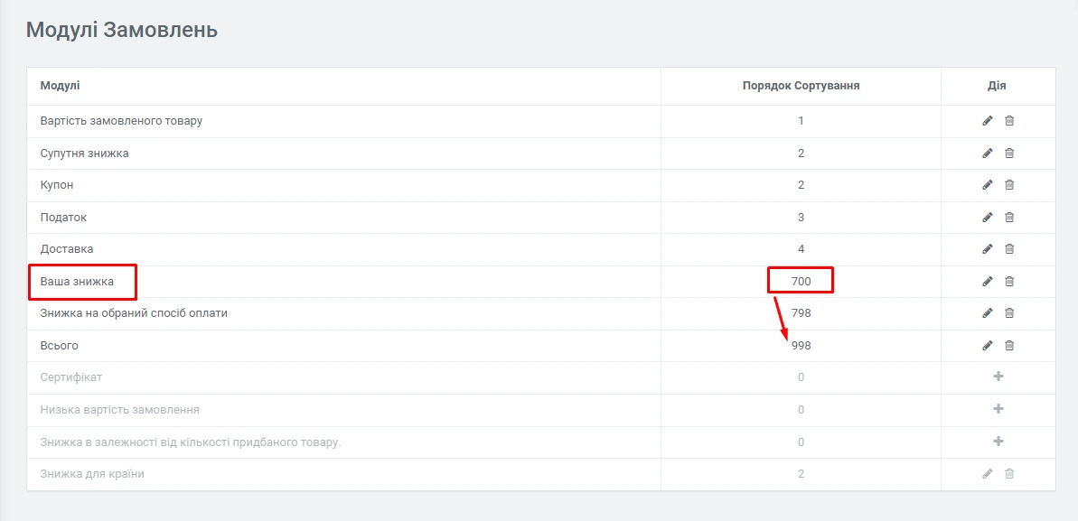 Важливим моментом є порядок сортування модуля знижки. Важливо щоб "Ваша знижка" була на порядок вище модуля "Всього" тоді сума в розрахунку буде вказуватися за мінусом знижки.