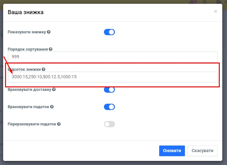 І в рядку "Відсоток знижки" встановіть цінові межі та відсотки знижки через кому: