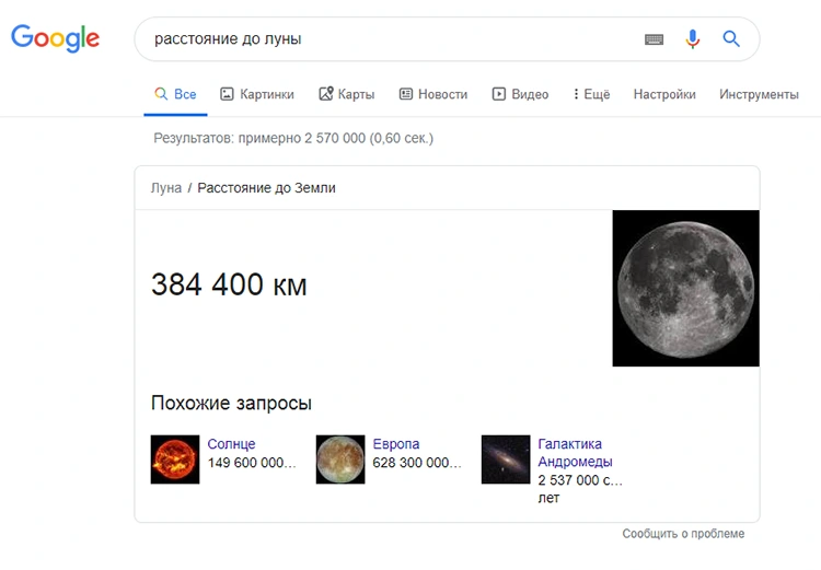 1. Rich Answer (дослівно Багата Відповідь), також Миттєва Відповідь, Швидка Відповідь – Не Обраний Фрагмент. При запиті користувача (частіше за все це питання про дані планети або обчислення чисел) користувач отримує миттєву, коротку відповідь.