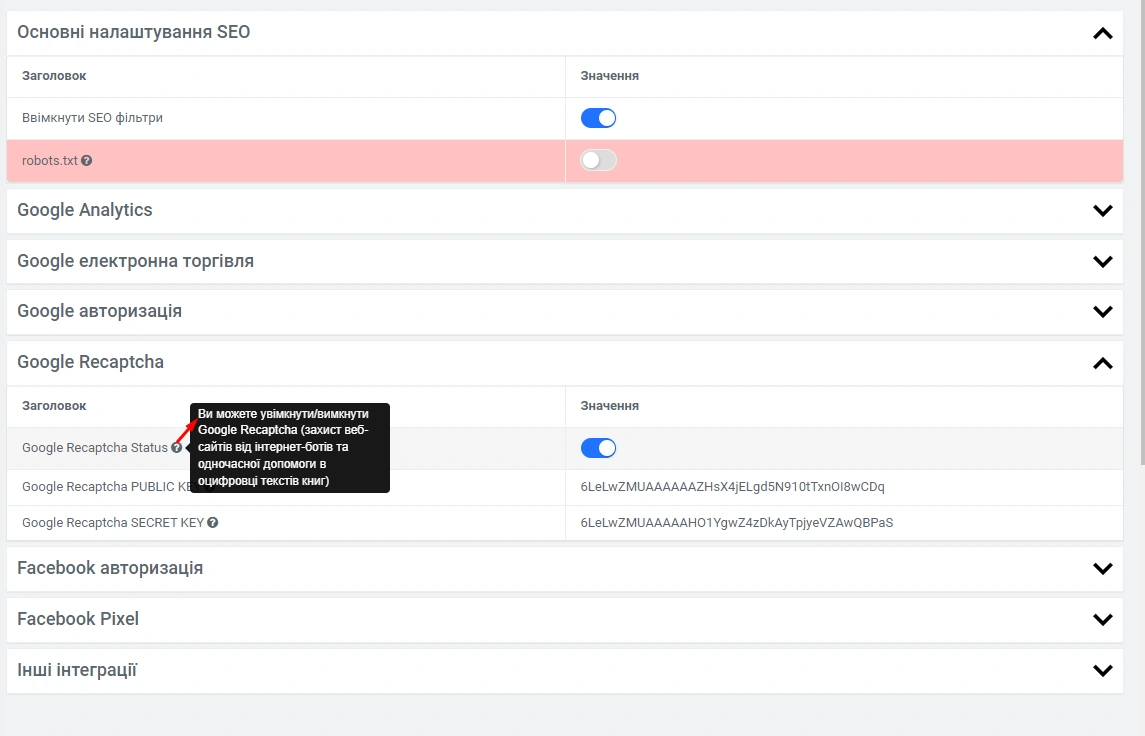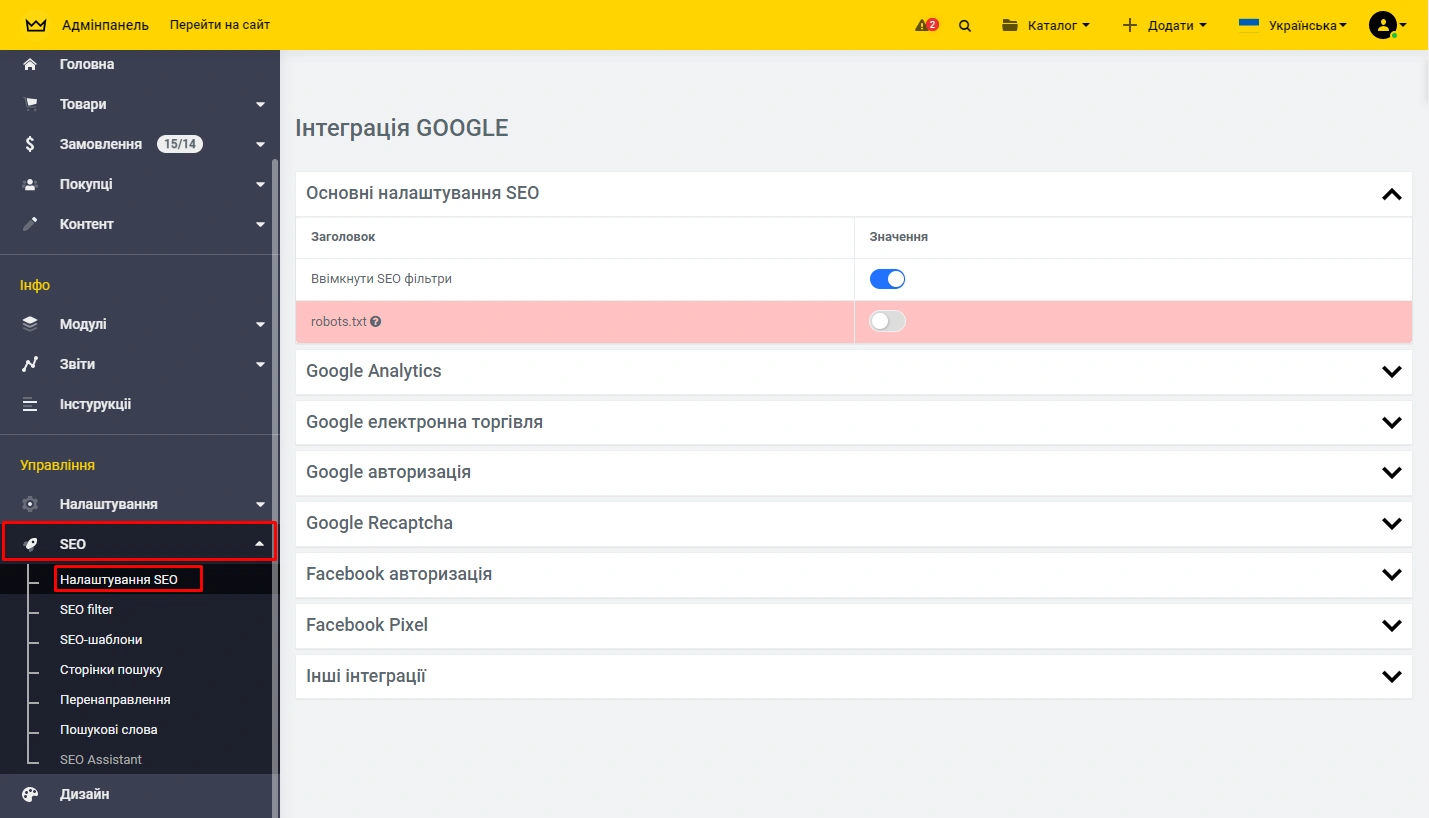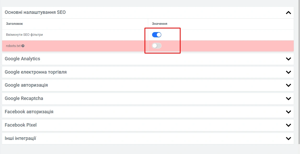 Тут у Вас є можливість увімкнути/вимкнути статус для налаштувань SEO, натиснувши при цьому важіль кнопки статусу: