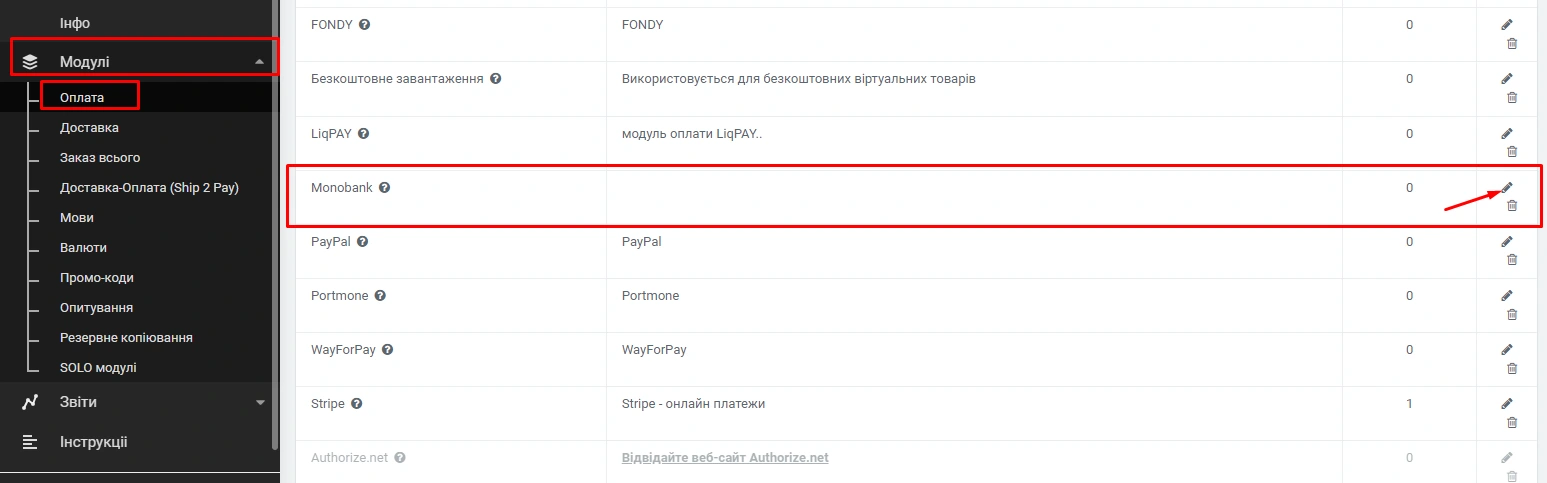 Для того, щоб налаштувати модуль оплати, перейдіть в панель адміністрування «Модулі» -> «Оплата» -> «Monobank» якщо він у Вас не активний натисніть на іконку "+"
