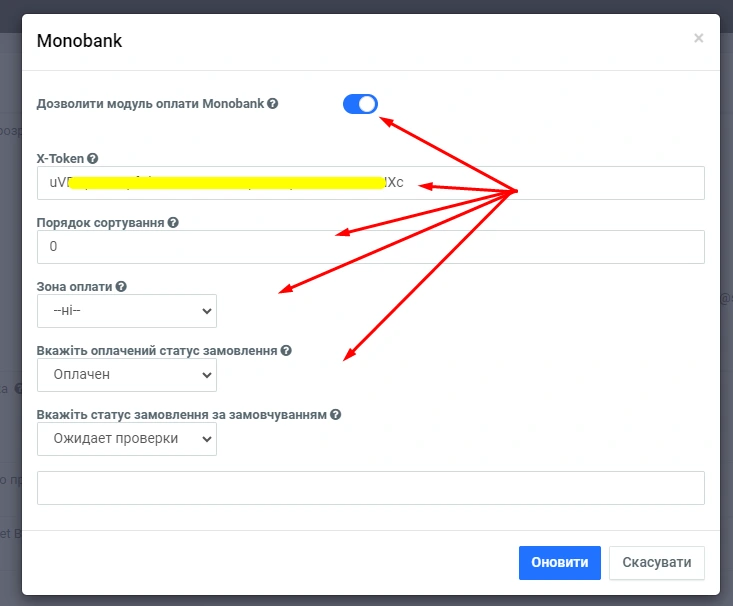 В Адмінпанелі Ви перейдете в модальне вікно налаштування модуля, тут Ви можете увімкнути/вимкнути модуль, налаштувати/встановити - X-Token , далі, встановити порядок сортування в чекауті, зону оплати (за потреби) та статуси замовлення.