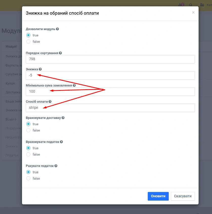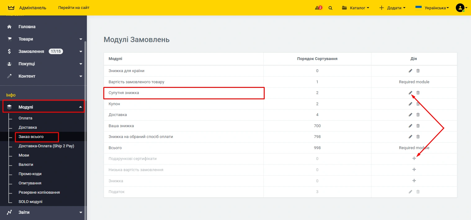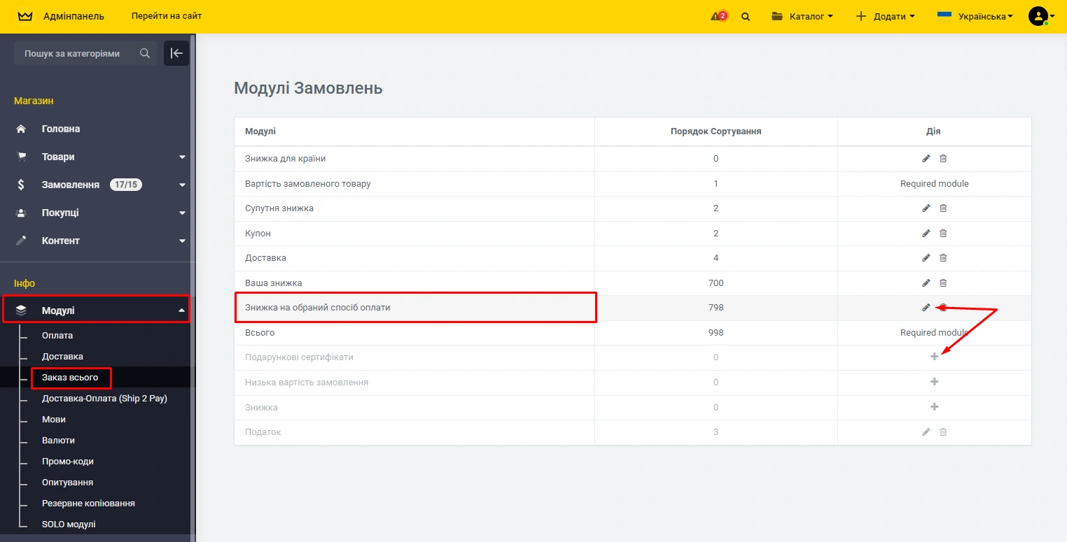 Для початку увімкніть сам модуль "Знижка на обраний спосіб оплати", для цього в панелі адміністрування перейдіть «Модулі» -> «Замовлення разом» -> «Знижка на обраний спосіб оплати» якщо він у Вас не активний, натисніть на іконку "+" для активації, для редагування функціоналу натисніть на іконку "олівець"