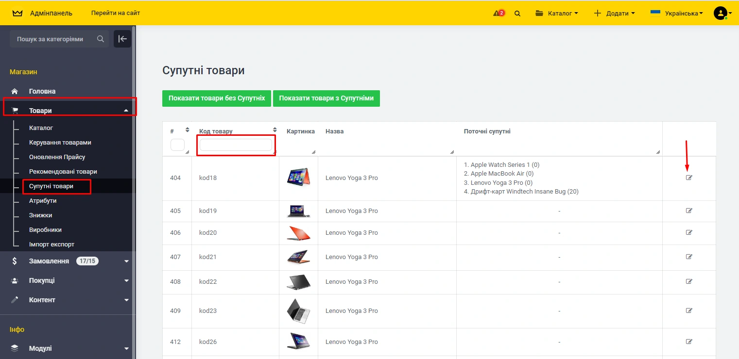 Після того, як Ви включили модуль, потрібно перейти налаштувати супутній асортимент товарів, для цього в панелі адміністрування «Товари» -> «Супутні товари» при наведенні на потрібний товар, або в рядку "Код товару", Ви зможете знайти товар за кодом/артикулом , натисніть кнопку "редагувати":