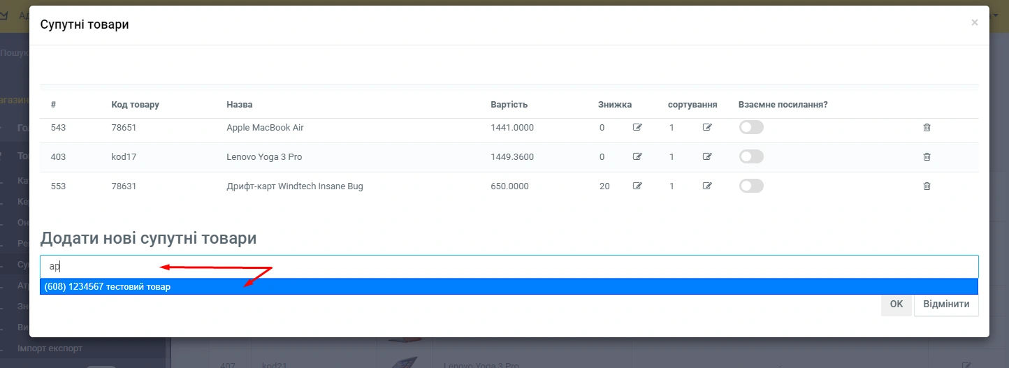Внесіть назву товару в рядок "Додати нові супутні товари":