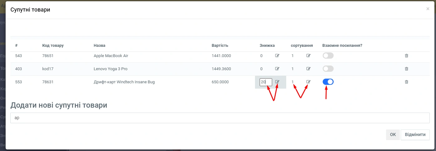 та товар автоматично додатись до "Супутніх" тут Ви зможете додати розмір знижки, розмістити сортування або видалити якщо товар більше не потрібен у цій категорії, також можете активувати кнопку "Взаємне посилання", тоді товари будуть доступні в блоці "Супутні" - взаємно: