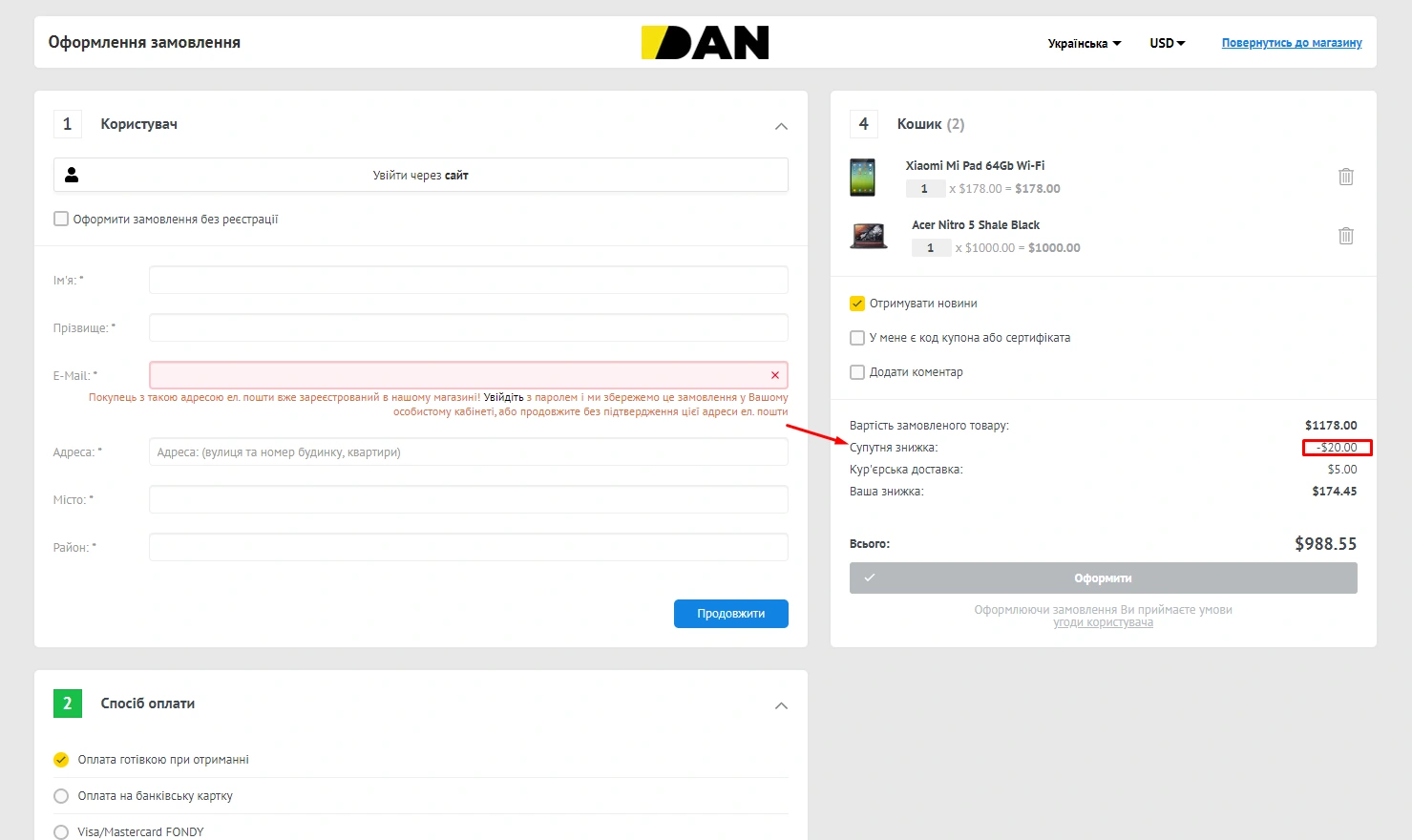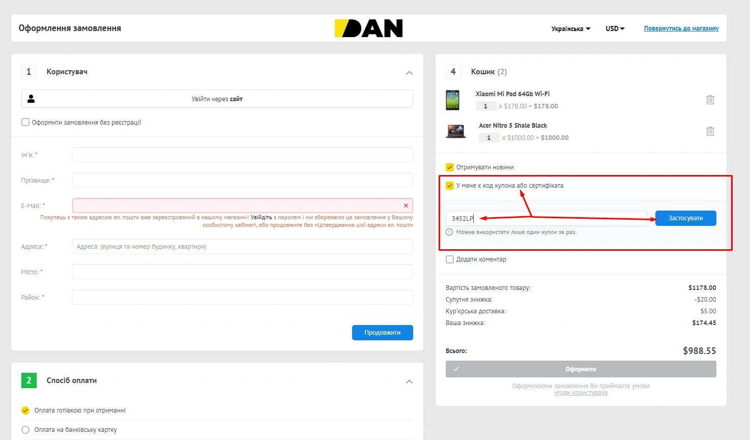 Щоб клієнт при оформленні замовлення зміг скористатися купоном, він повинен вести його номер у чекауті і натиснути кнопку застосувати: