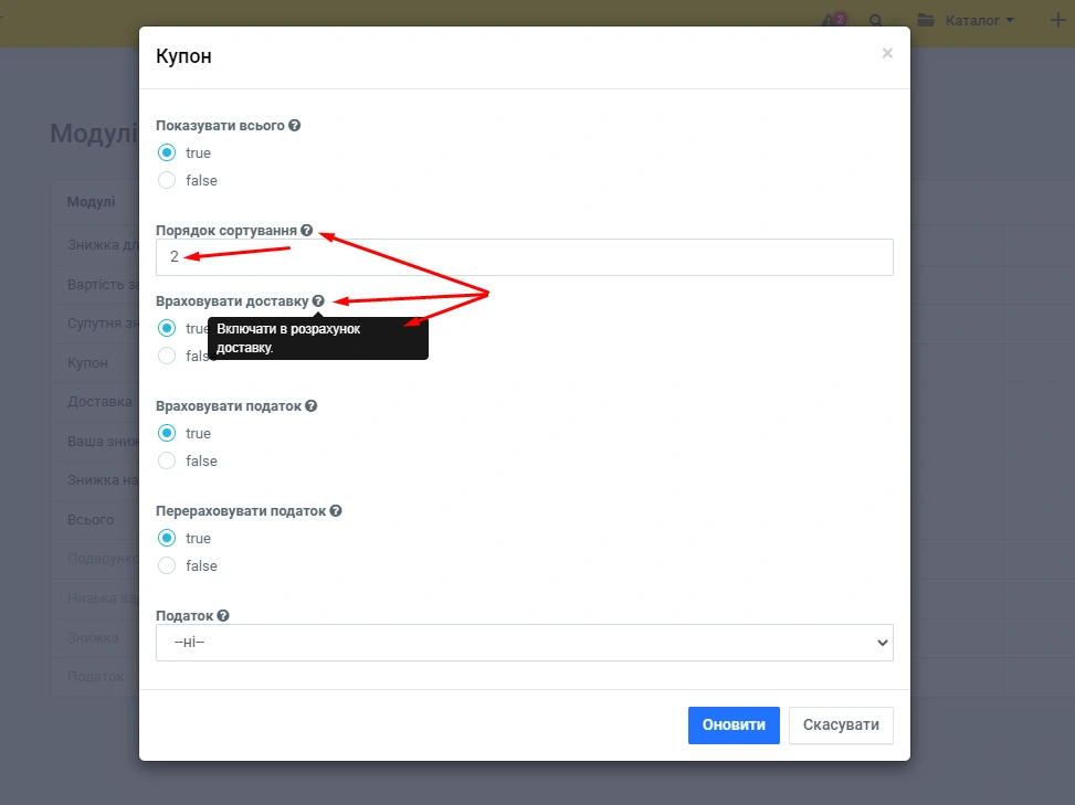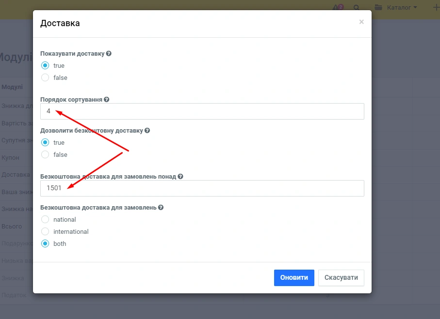 Модальне вікно модуля "Доставка" в якому є можливість налаштувати функціонал, наприклад порядок сортування (при наведенні на іконку "знак питання" доступні підказки для поточного поля) або безкоштовну доставку приклад налаштування якої можна переглянути https://solomono.net/uk/priklad-nalashtuvannja-bezkoshtovnoji-dostavki-vid-pevnoji-sumi-zamovlen-a-561.html