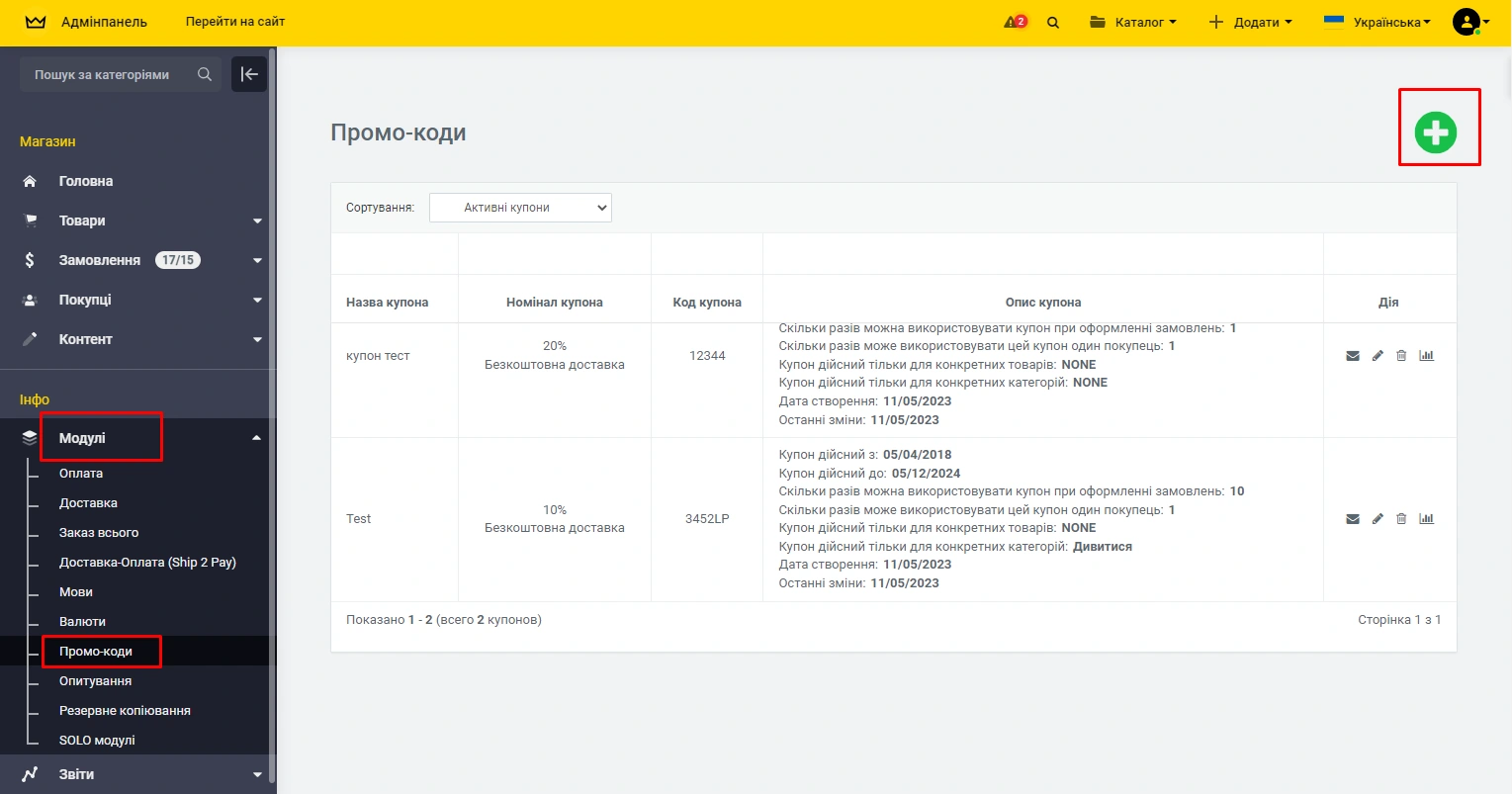 Після того, як Ви включили модуль, потрібно додати купон, в панелі адміністрування «Модулі» -> «Промо-коди» натисніть на іконку "+",