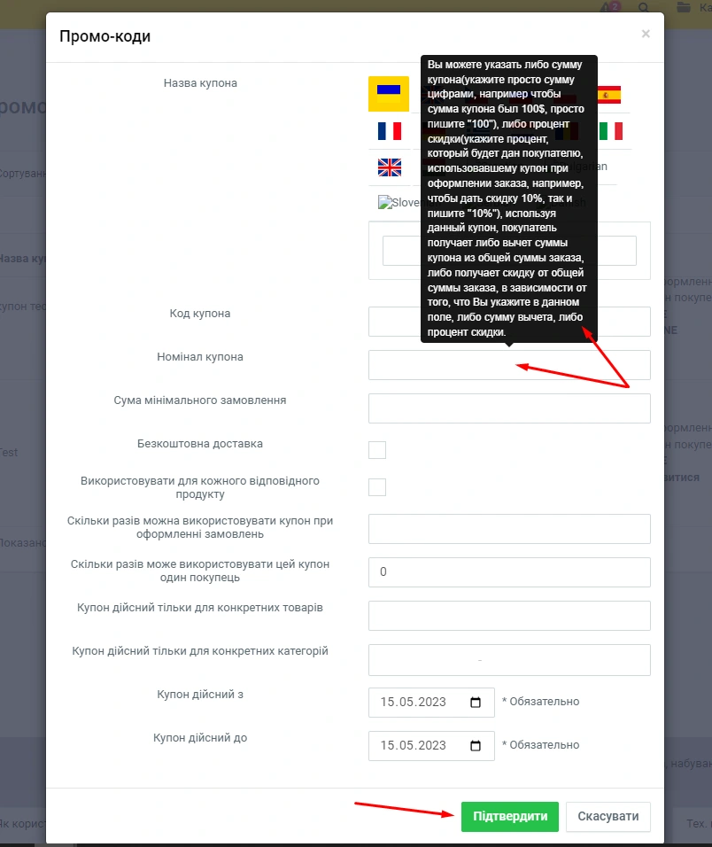 Модальне вікно модуля "Купон" в якому можна налаштувати функціонал (при наведенні на іконку "знак питання" доступні підказки для поточного поля)