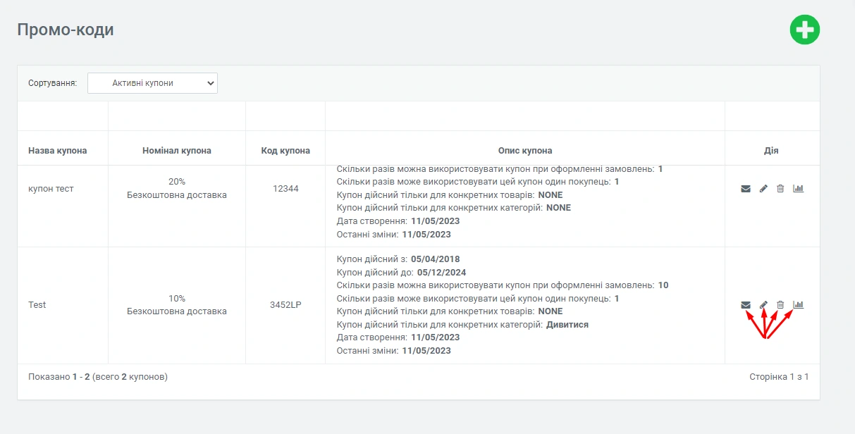 Ви зможете на Ваш розсуд керувати купонами: відправляти на email клієнту, редагувати, видаляти та переглядати статистику.