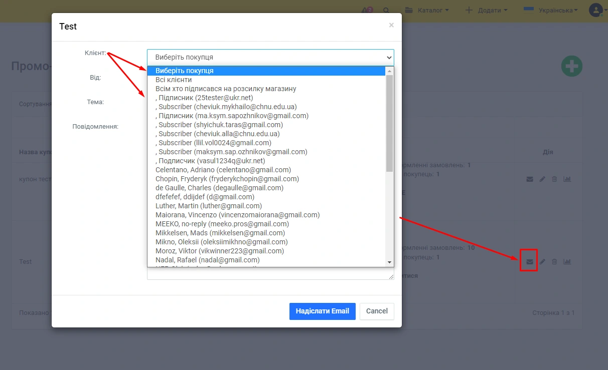 Уточнення! Відправити купони клієнтам можна безпосередньо з «Модулі» -> «Промо-коди» натиснувши на конвертик, де можна вибрати: відправити всім клієнтам, або всім клієнтам, які підписалися на розсилку магазину, або вибрати конкретного клієнта.