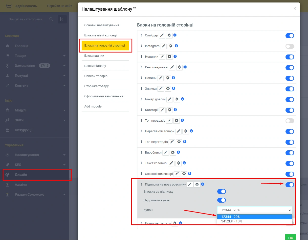 Також для отримання промо-кодів під час передплати на розсилку в адмінпанелі «Дизайн» -> «Блоки на головній сторінці» -> «Підписка на нову розсилку» активуючи підписку Ви зможете вказати потрібний купон, і тоді клієнту, який підписався на розсилку Вашого інтернет-магазину, на його пошту, буде відправлено номер купона для покупки.