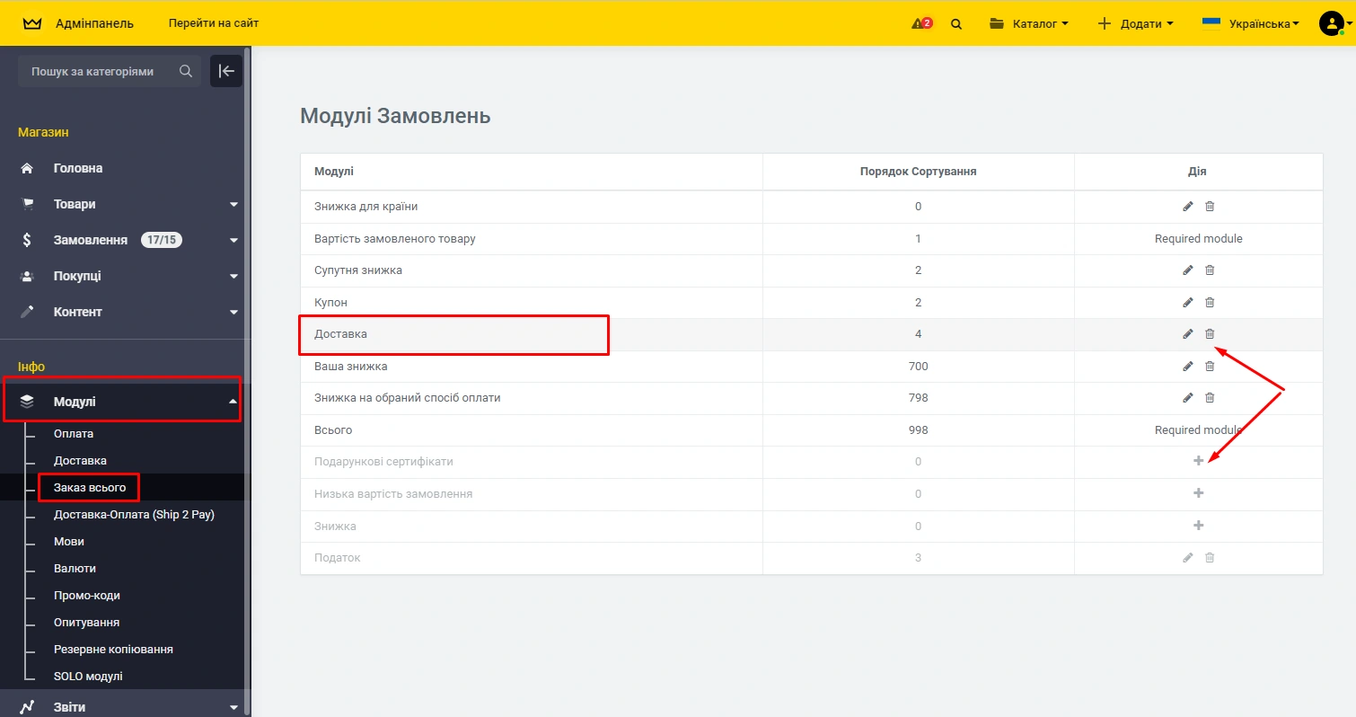 Для початку увімкніть сам модуль "Доставка", для цього в панелі адміністрування перейдіть "Модулі" -> "Замовлення разом" -> «Доставка» якщо він у Вас не активний натисніть на іконку "+" для активації, для редагування функціоналу натисніть на іконку "олівець"