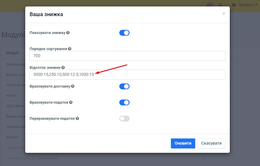Для початку увімкніть сам модуль "Ваша знижка", для цього в панелі адміністрування перейдіть «Модулі» -> «Замовлення разом» -> «Ваша знижка» якщо він у Вас не активний натисніть на іконку "+" для активації, для редагування функціоналу натисніть на іконку "олівець"