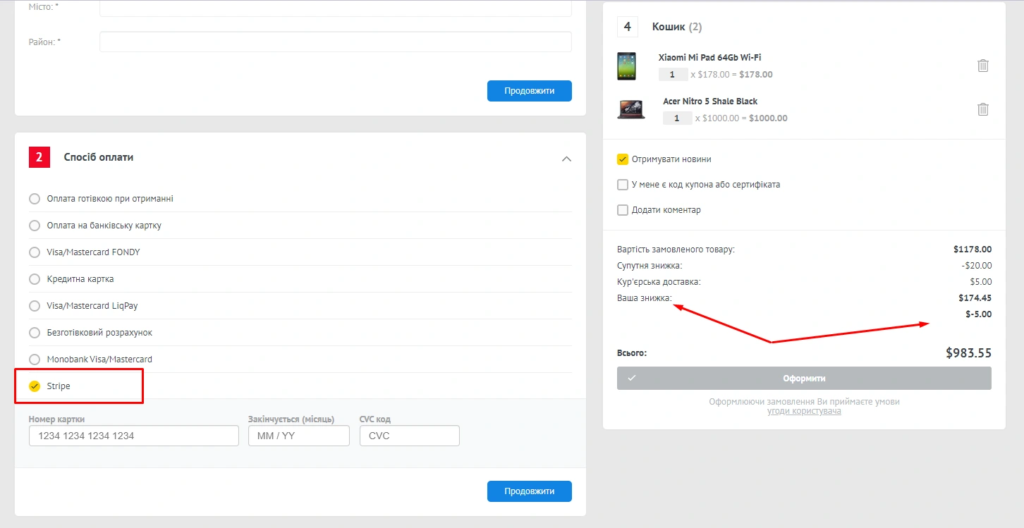 В результаті, при покупці товару 100 і вище, виборі оплати "stripe" при оформленні замовлення у чекауті у клієнта буде доступна така знижка:
