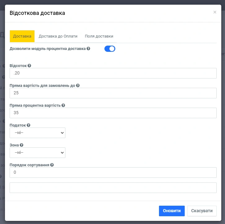 З порядком та особливостями налаштування додаткових полів, оплати для окремих зон та налаштування безпосередньо самих зон, Ви можете ознайомитись, переглянувши інструкцію за посиланням: https://solomono.net/uk/nalashtuvannja-dodatkovih-poliv-dostavki-nalashtuvannja-oplati-za-pevnoju-zonoju-a-619.html