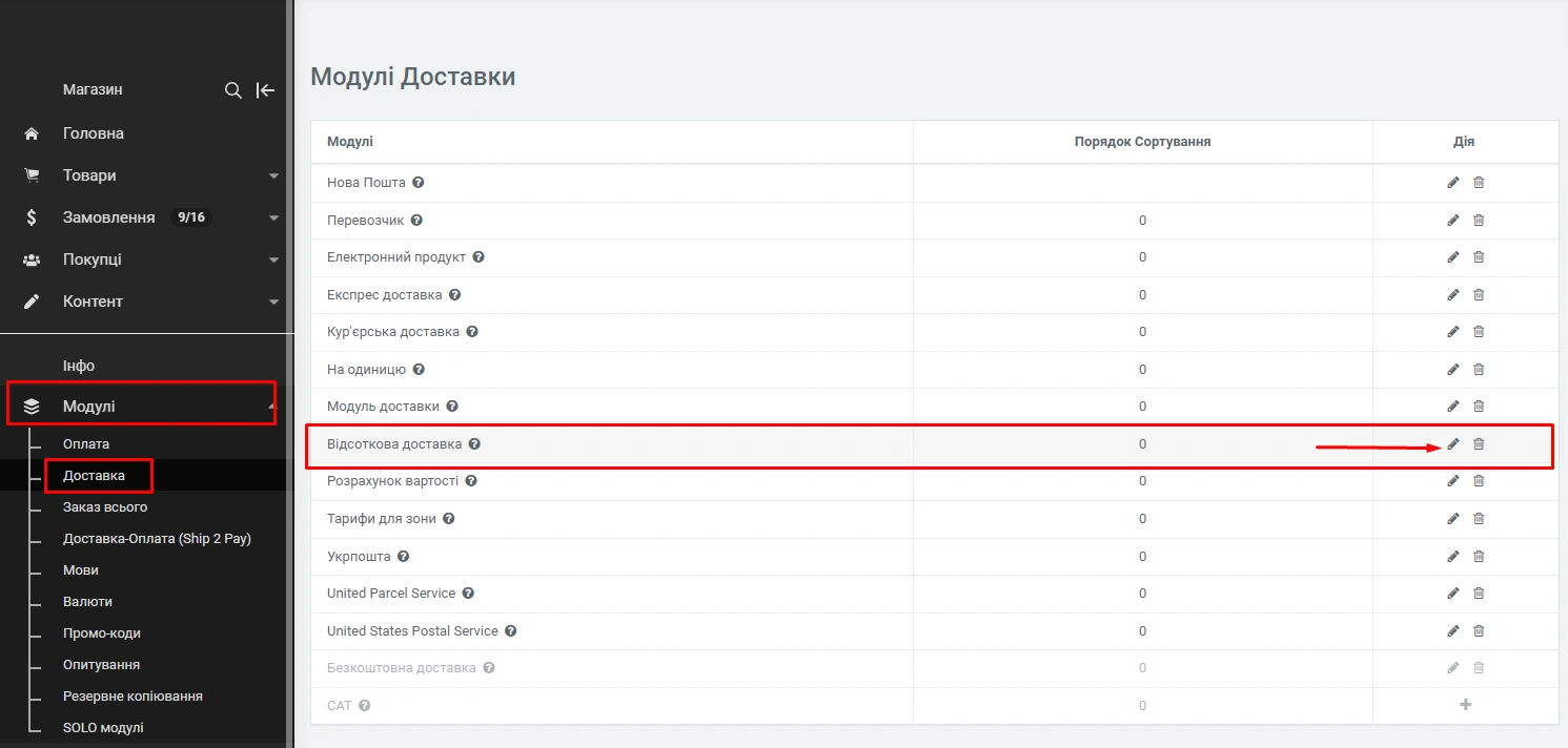 Для початку увімкніть сам модуль, для цього в панелі адміністрування перейдіть «Модулі» -> «Доставка» -> «Відсоткова доставка» якщо він у Вас не активний, натисніть на іконку "+"