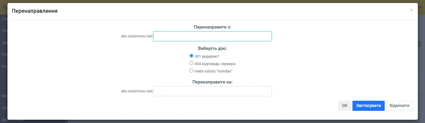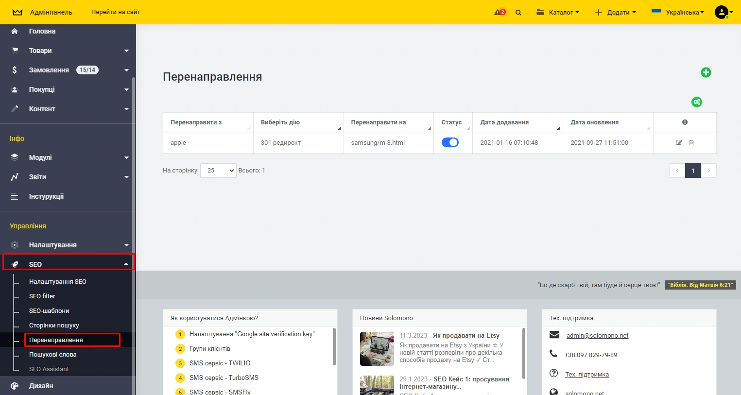 Команда Solomono розробила зручний функціонал для роботи з перенапрямками. Щоб налаштувати перенаправлення, необхідно зайти на сторінку адміністрування в розділ SEO -> Перенаправлення -> натиснути на «+»: