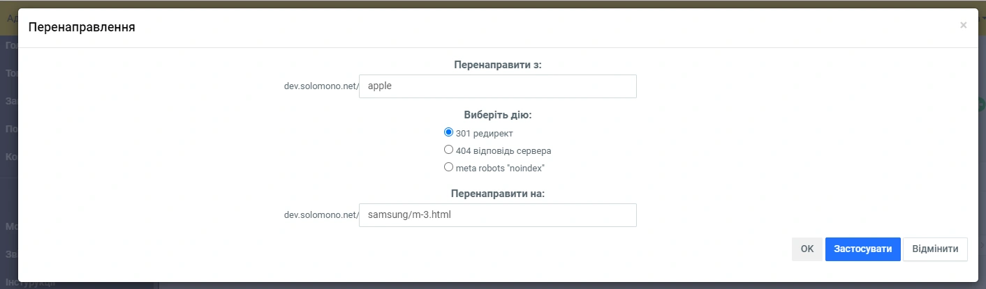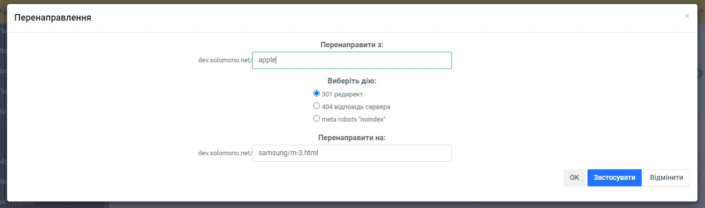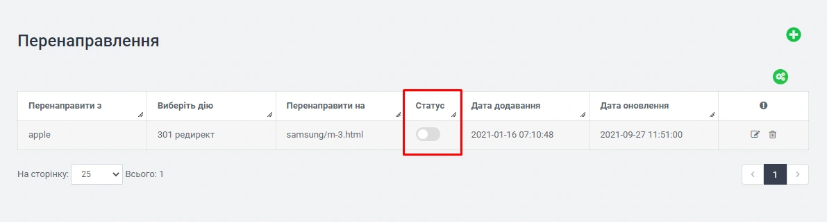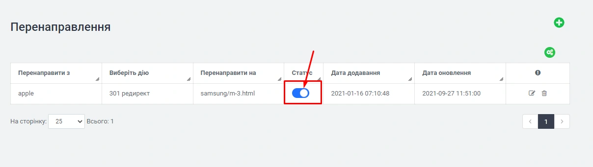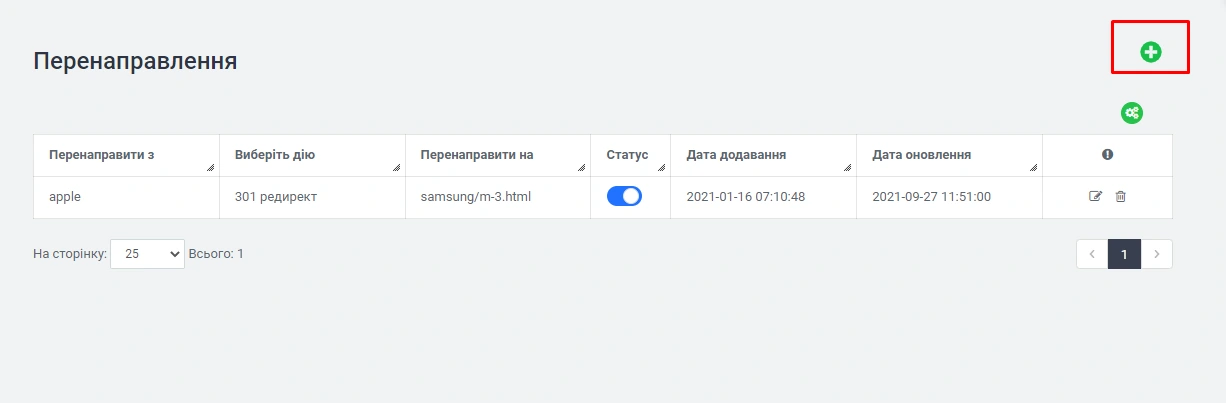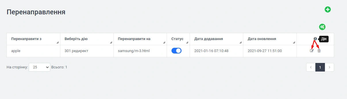 Також Ви можете редагувати або видалити чинні редиректи, натиснувши в колонці дію на потрібну кнопку: