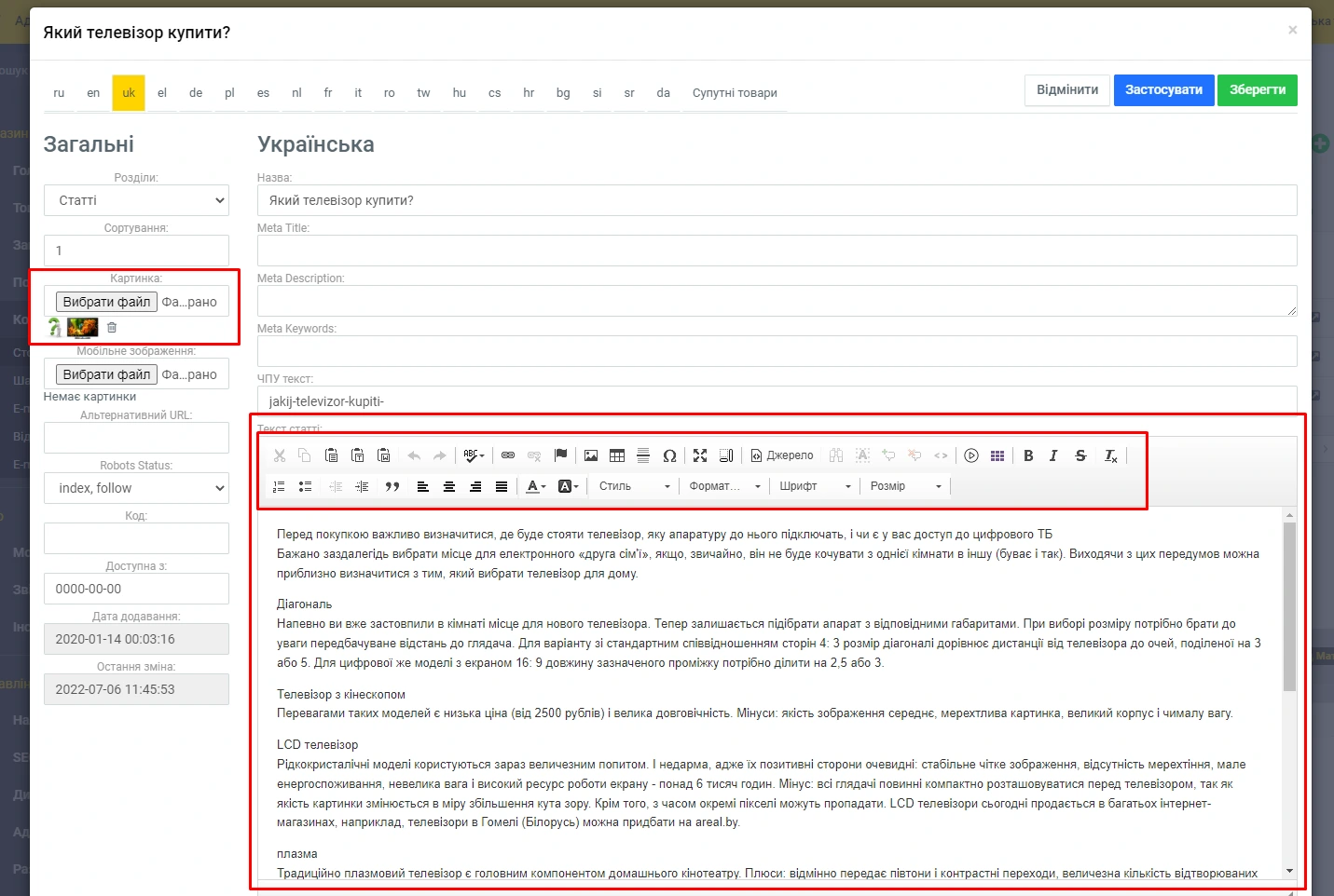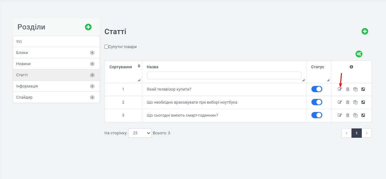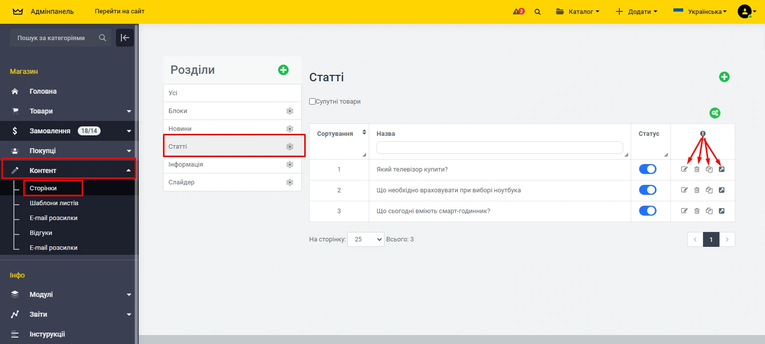 В панелі адміністрування -> "Контент" -> "Сторінки" -> "Статті", у Вас є можливість редагувати, видаляти, переміщати та переглядати Ваші статті: