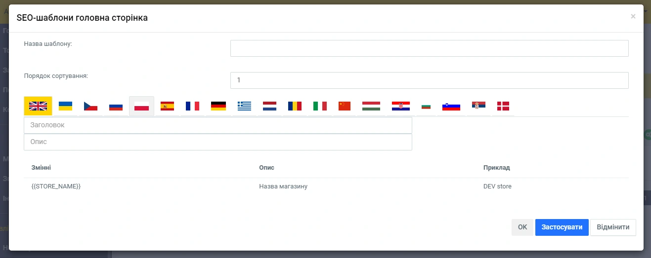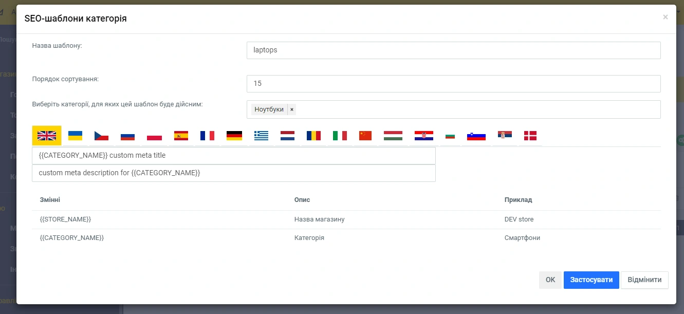 Модуль "SEO Шаблони" дозволяє встановити індивідуальні шаблони полів meta title та meta description для основних видів сторінок інтернет-магазину.
