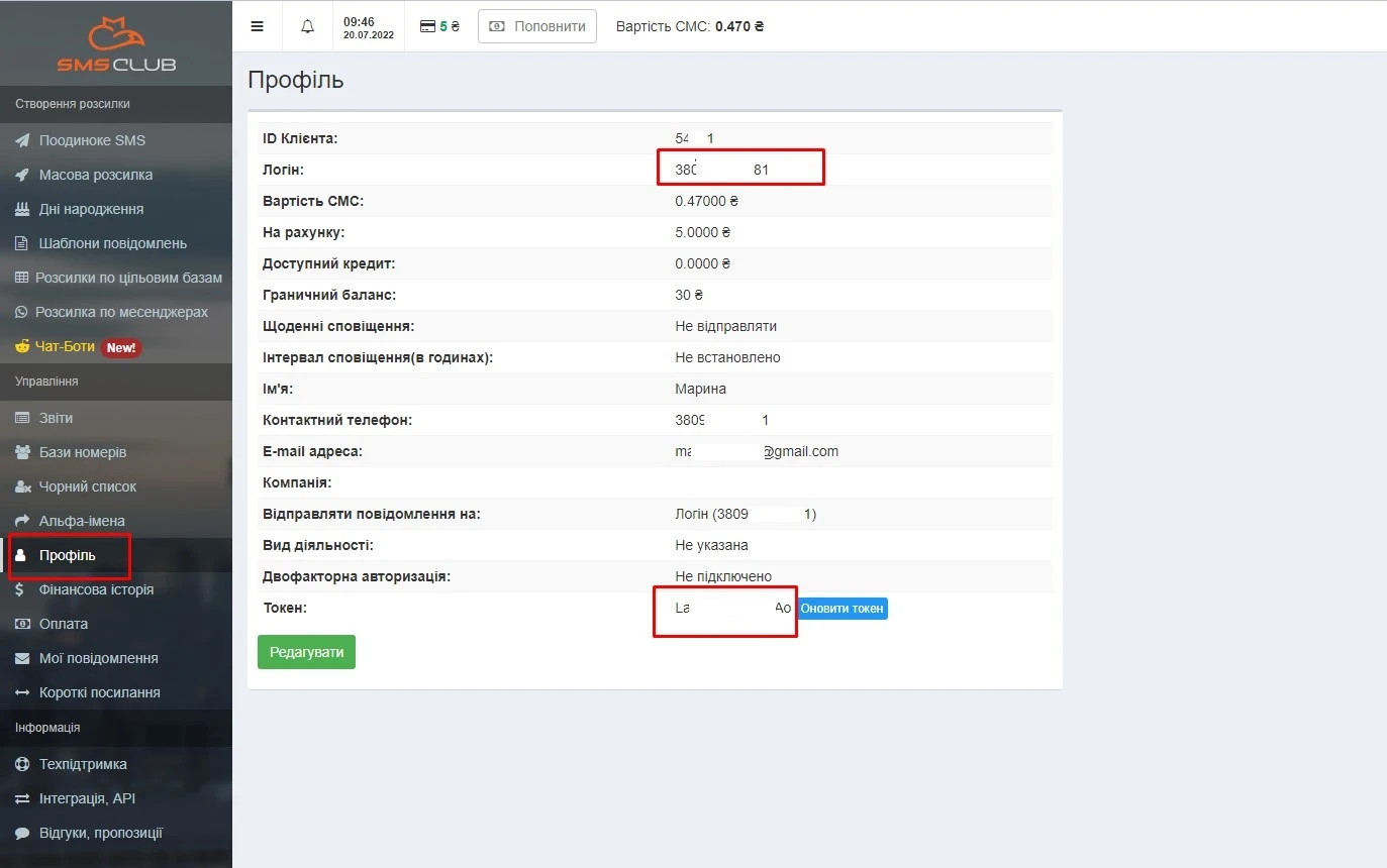 Скопіюйте Логін та Токен. Перейдіть до розділу Альфа-імена та скопіюйте альфа-ім'я.
