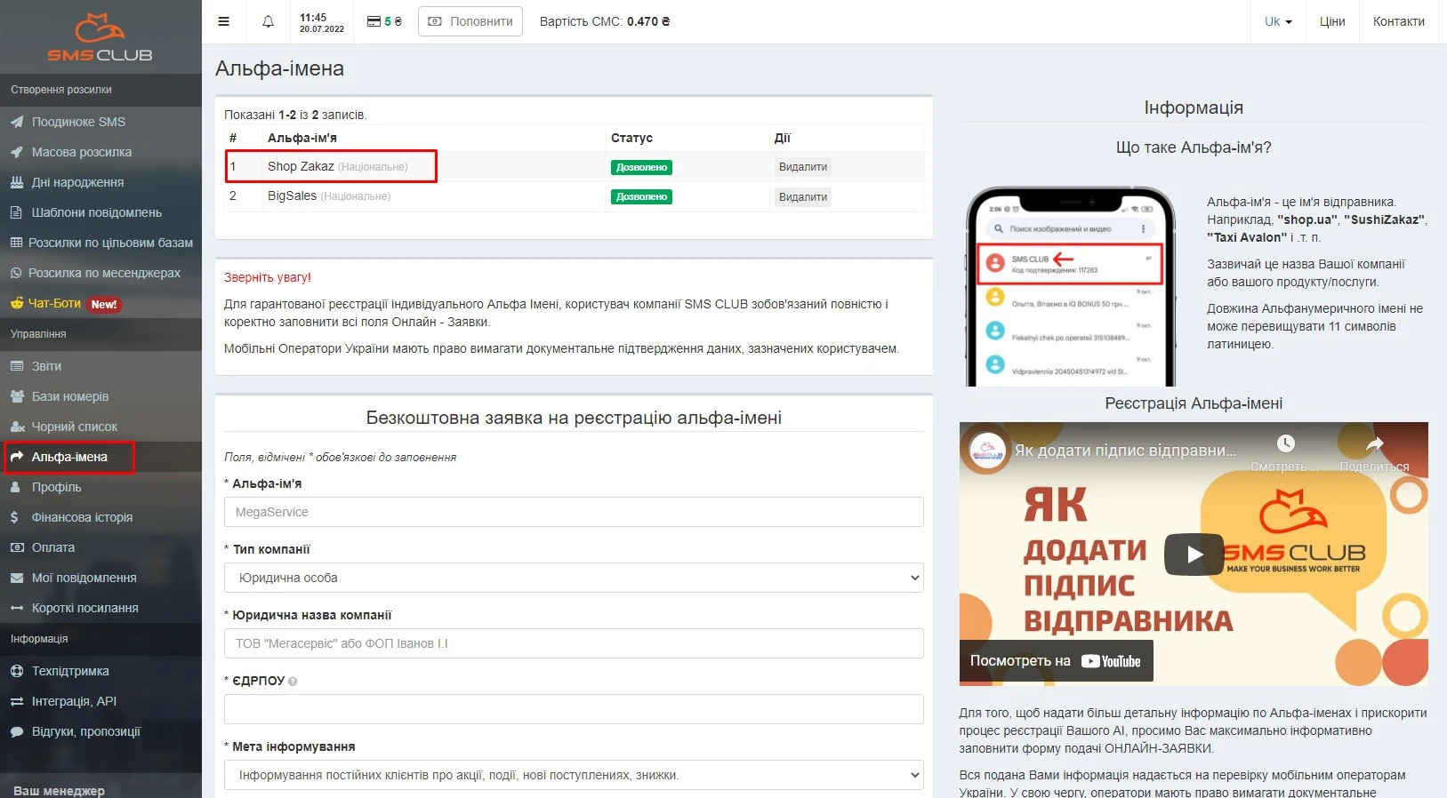 Зареєструйтесь на сайті: https://smsclub.mobi/