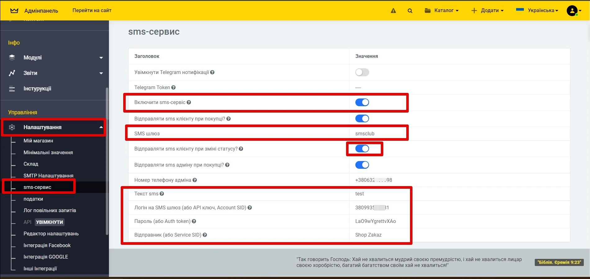 Перейдіть в налаштування модуля sms-сервіс та заповніть поля: