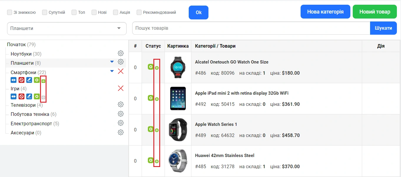 На сторінці "Товари" - "Каталог" ви можете позначати, які категорії та товари потраплять у файл при XML експорті. За це відповідає перемикач "Статус вигрузки XML" - правий зелений перемикач в меню дій для категорій та правий зелений перемикач в колонці "Статус" для товарів.