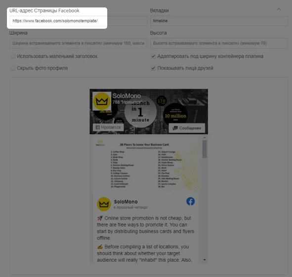 У сторінці , необхідно ввести вашу URL-адресу сторінки в Facebook (наприклад: https://www.facebook.com/solomonotemplate/)