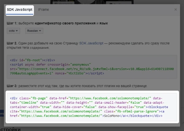 У вікні, на вкладці "SDK Java Script" копіюєте код з кроку №3, який нам, згодом, необхідно буде вставити на сайті.