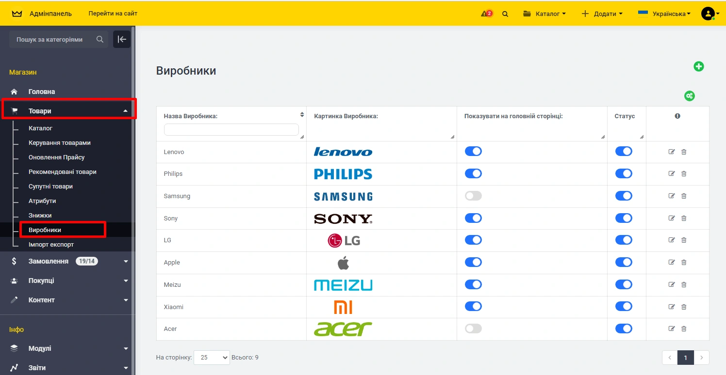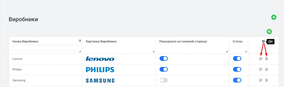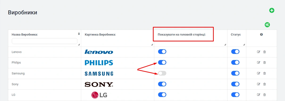Для відображення виробників на головній сторінці потрібно переключити повзунок у колонці "Показувати на головній сторінці"