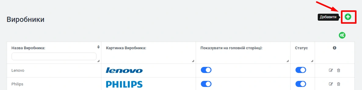 Для додавання нового виробника необхідно натиснути на кнопку “Додати”: