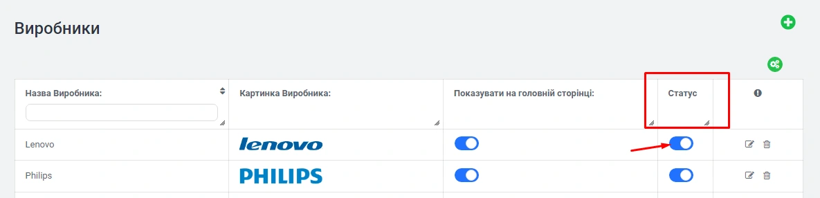 Для відображення інформації про виробника на сайті потрібно переключити повзунок у колонці Статус та активувати його.
