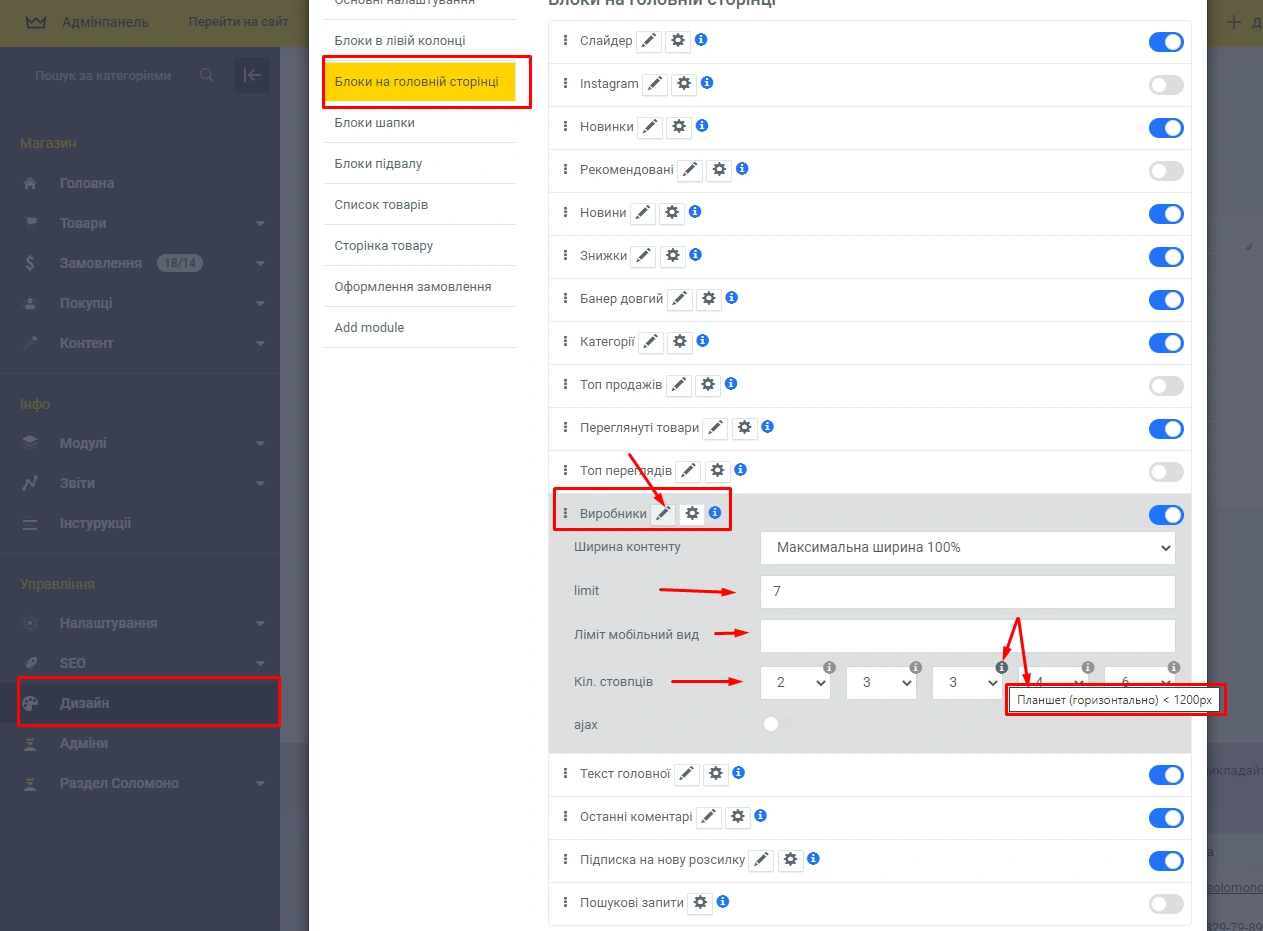 Команда Solomono розробила зручний функціонал для роботи з блоком виробників, де Ви зможете вказати скільки логотипів/блоків буде виводитися як для десктопу, так і для мобільної версії, також необхідну кількість логотипів/блоків можна виставити і для різних девайсів, для кожної колонки є підказка для тієї чи іншої роздільної здатності екрана.