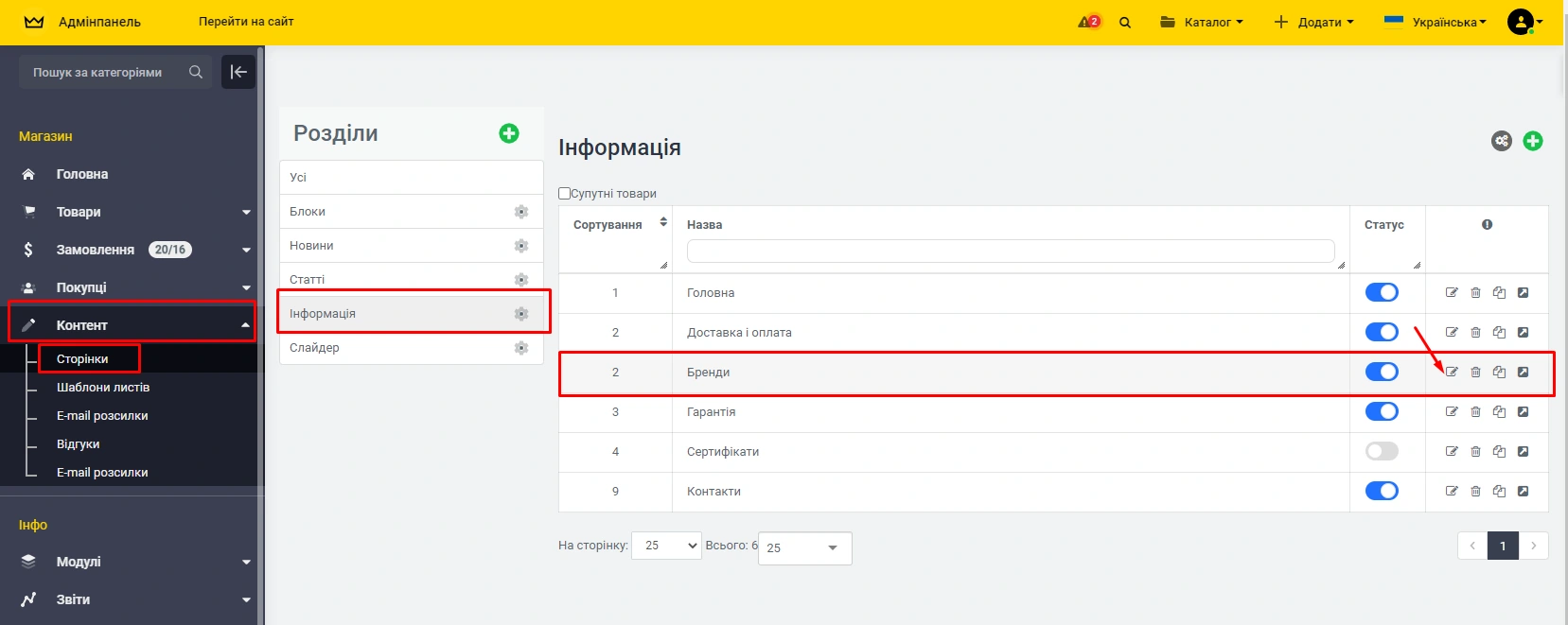 Для того щоб вивести посилання БРЕНДИ на головній сторінці в шапці, то в панелі адміністрування: -> «Контент» -> «Сторінки» -> «Інформація» -> «Бренди» потрібно натиснути на іконку "редагування":