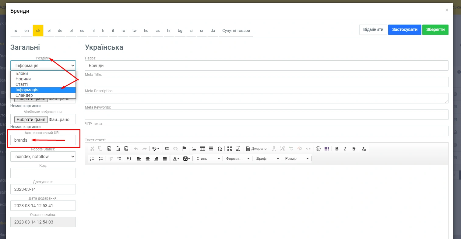 у рядку прописати "Альтернативний URL", також потрібно звернути увагу на те, щоб блок розміщувався в розділах "Інформація", саме цей розділ відповідає за виведення категорій у шапці Вашого сайту: