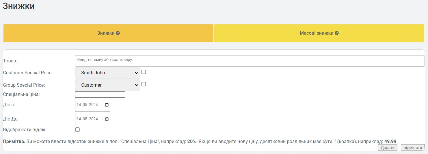Про роботу з масовими знижками можете прочитати в окремій інструкції.