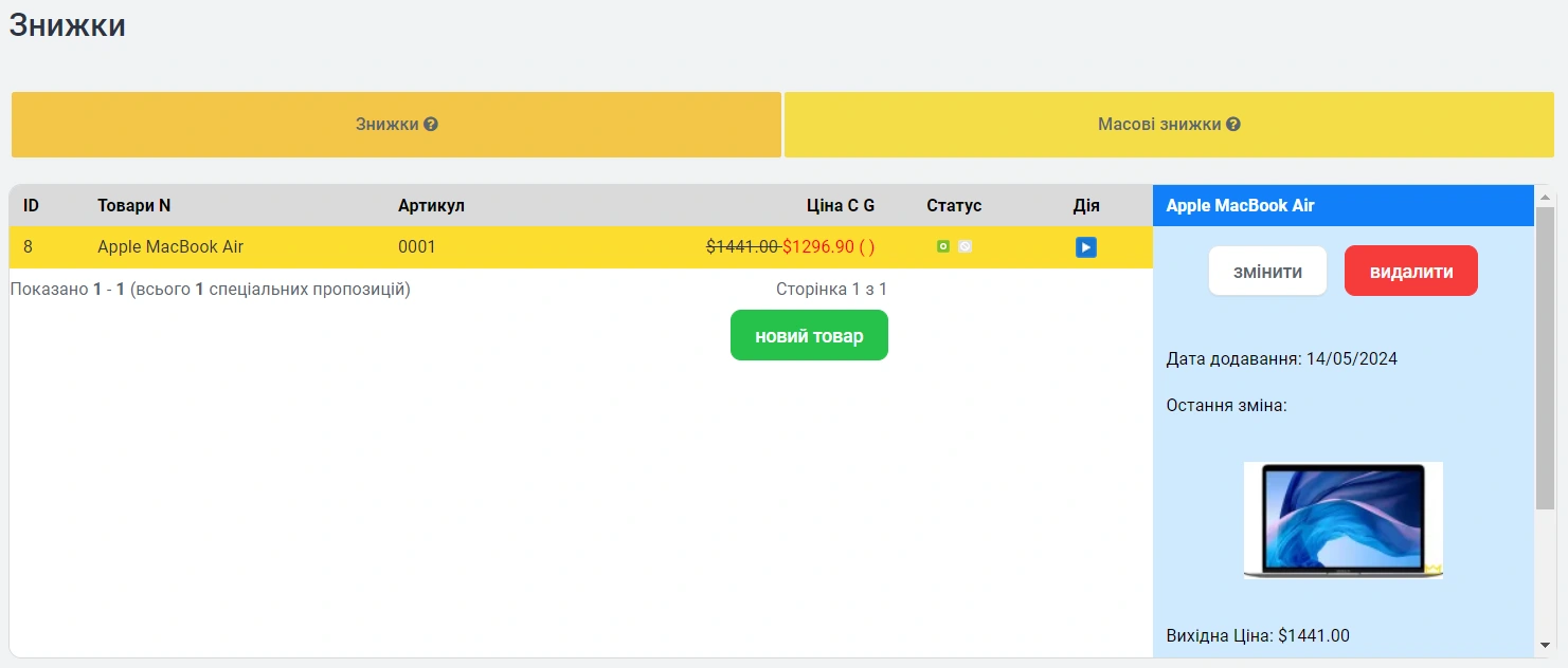Після збереження, знижка з'явиться у списку. Якщо вам потрібно відредагувати її, натисніть на кнопку в колонці "Дія" поруч з потрібною вам знижкою, або ж натисніть на знижку в списку та натисніть "Змінити" у синьому блоці праворуч. В цьому ж блоці ви можете натиснути "Видалити", щоб видалити виділену знижку. У списку в колонці "Статус" ви можете вимикати чи вмикати знижку, не видаляючи її.