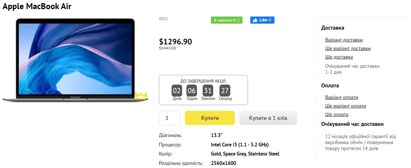 Якщо ви поставили позначку в полі "Відображати відлік" під час налаштування знижки, то на сторінці товару зі знижкою з'явиться блок з відліком.