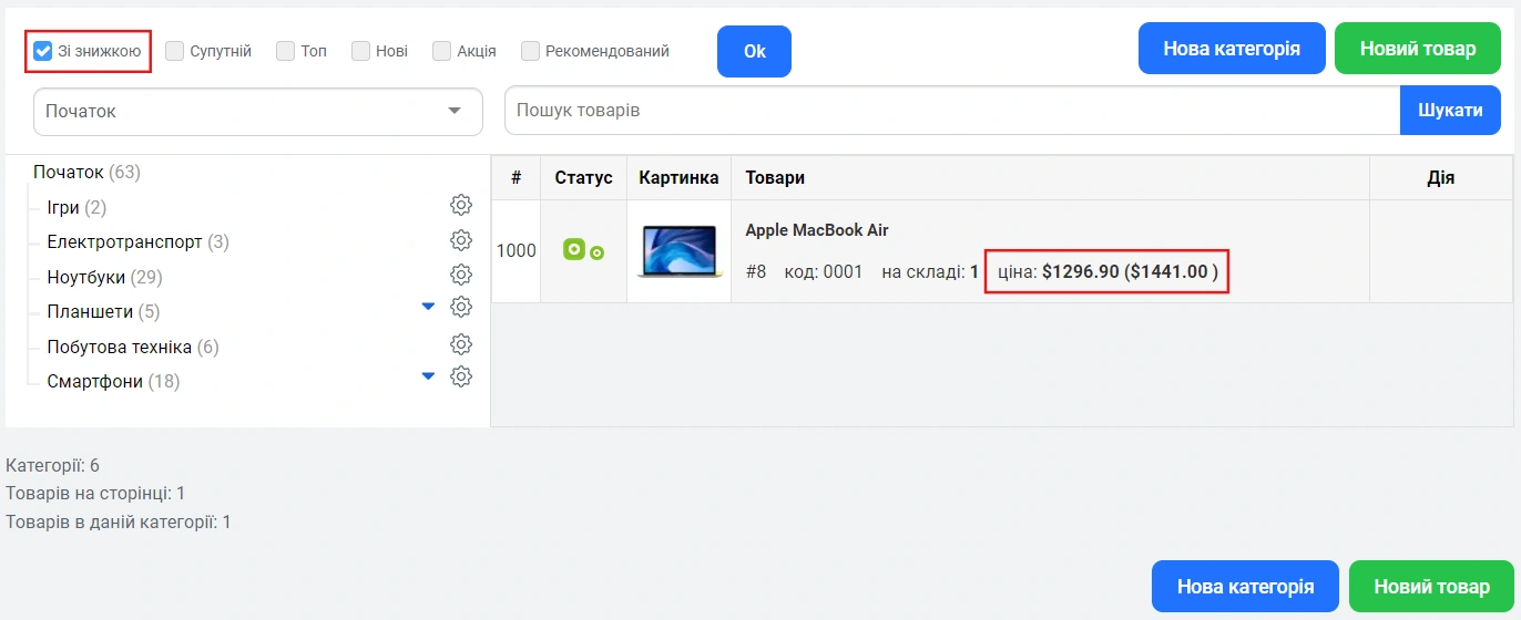На сторінці "Товари" - "Каталог" знижки теж відображатимуться. Крім того, ви можете відфільтрувати ваш каталог, щоб побачити усі ваші акційні товари, поставивши позначку в полі "Зі знижкою" та натиснувши "Ок".