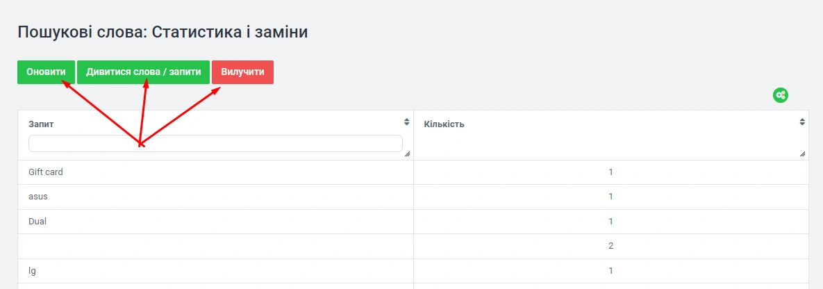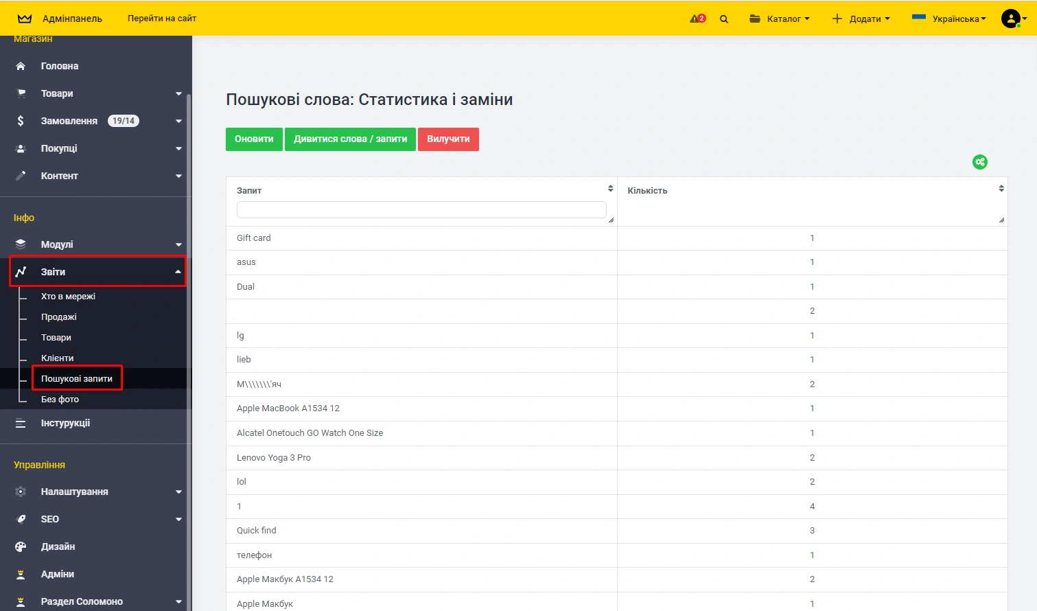 Управління звітом здійснюється через панель адміністрування: -> «Звіти» -> «Пошукові запити»: