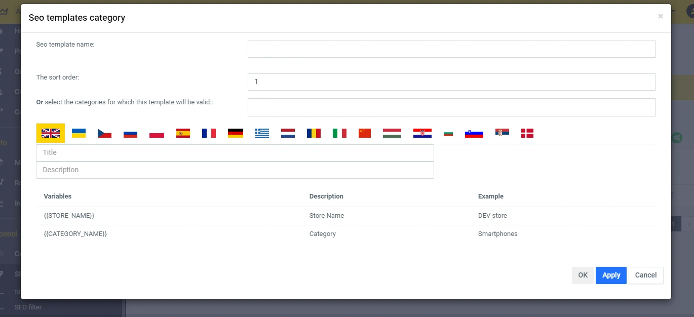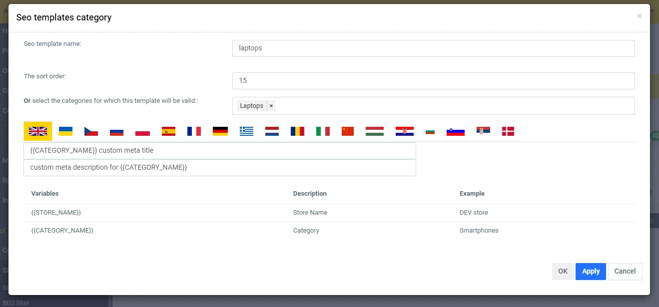 The "SEO Templates" module allows you to set individual templates for the meta title and meta description fields for the main types of pages of the online store.